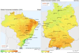 - Seus índices de irradiação são muito expressivos, destacando-se que as suas regiões menos ensolaradas são muito mais irradiadas do que as regiões mais ensolaradas da Alemanha por exemplo, que em 2019 estava entre os cinco países com maior capacidade instalada de energia solar fotovoltaica no mundo.